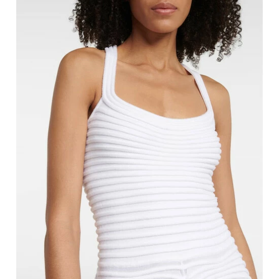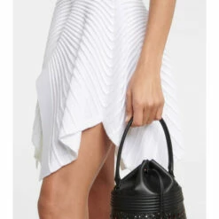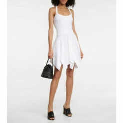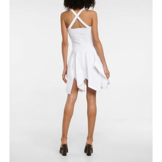 This Alaïa minidress is structured with deep-set Ottoman ribbing to hold its sculptural shape. It has supportive crossover straps at the back and a flowing handkerchief hemline.