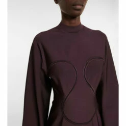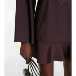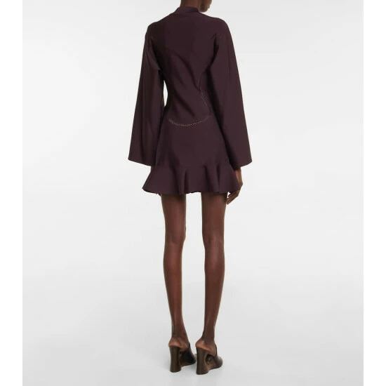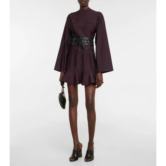 Made from shiny viscose, this minidress from Alaïa features open lace detailing that snakes along the bodice for a contouring effect. The sleek design is contrasted by a ruffle-trimmed hem.
