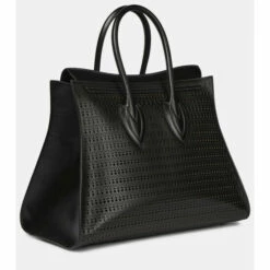Meet the newest member of Alaïa’s elegant bag family: the black Sidi tote. Structured and intricately laser-cut throughout, it’s a feat of refined craftsmanship. Notice the envelope flap top which secures on the inside so it doesn’t distract from the design.
