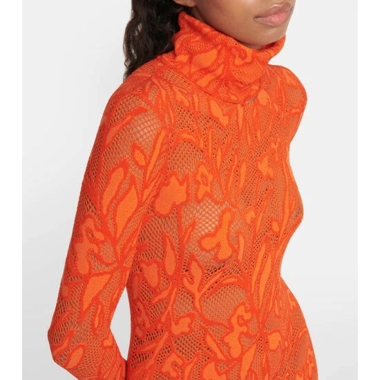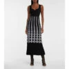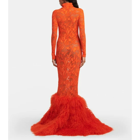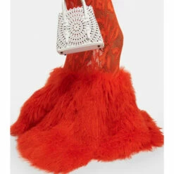 Known for unique creations, Alaïa presents this pompous maxi dress knitted in stretch lace. The figure-hugging design features a voluminous shearling hem that swivels for a graceful stride and is guaranteed to turn heads.