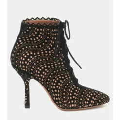 Make a feminine style statement with these black ankle boots from Alaïa. Made from a combination of suede and leather panels, which are laser-cut in the label’s signature Vienne motif, they have a point-toe silhouette with tapered stiletto heels that transition comfortably from day-to-dark settings.