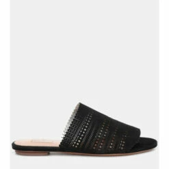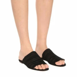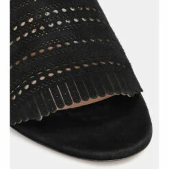 Slip on these black sandals from Alaïa for easy summer sophistication. Made in Italy, this pair features soft suede with laser-cut ‘Vienne’ motifs and fringed trim at the uppers, then is set on comfortable flat soles with subtle lift at the heels. Allow yours to ground everything from airy linen dresses to indigo denim.