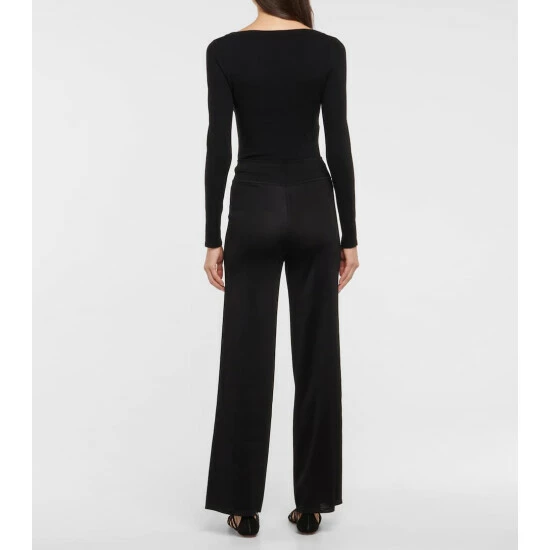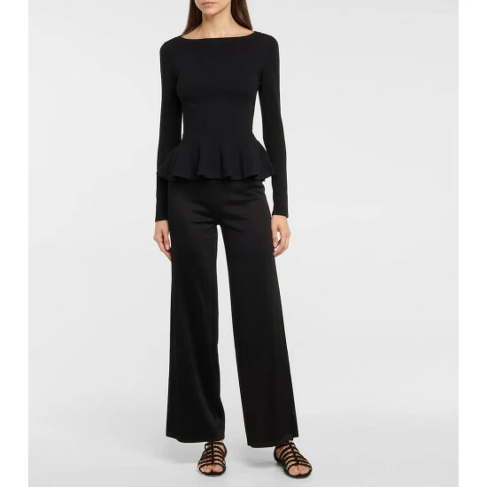 Master the language of understated elegance with these slinky pants from Alaïa. They’re made from a compact knit fabric to a wide-leg silhouette, and feature a ribbed waistband with scalloped trims.