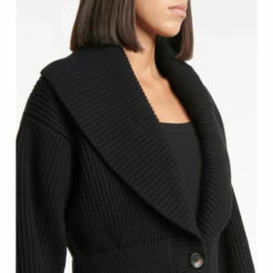 Knitwear from Alaïa is an ever-elegant addition to your collection, exhibited by this black cardigan. Ribbed-knit from cozy wool and cashmere, it has magnified shawl lapels and a signature peplum hem.
