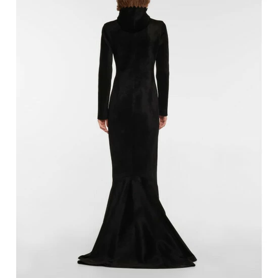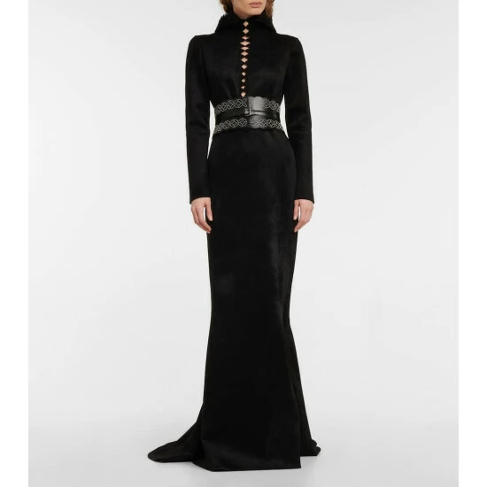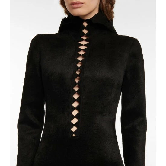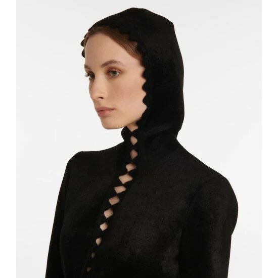 From its high neckline to its floor-sweeping hem, every inch of this gown exudes Alaïa’s signature elegance. Made from a soft wool-blend, it has a deep slit at the chest with scalloped edges.