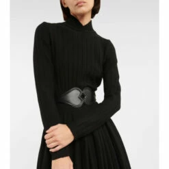 Alaïa’s body-hugging minidress falls into a subtly pleated skirt from the hips down. This long-sleeved design is made from a wool-blend knit with a wide ribbed bodice that features an open mock neck.